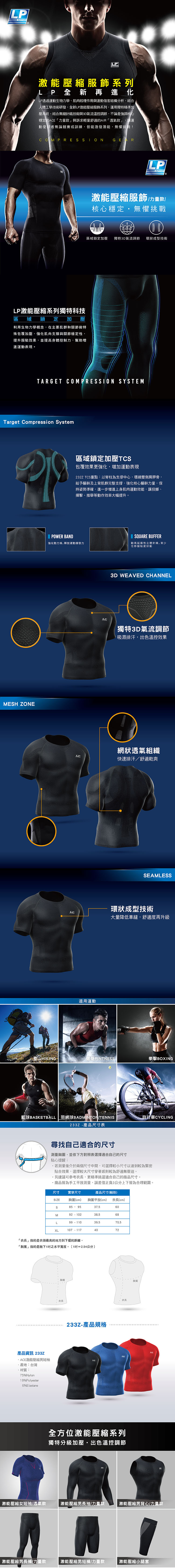 LP激能壓縮服飾系列,採用獨特精準分級加壓系統,結合無縫針織技術與3D氣流溫控設計,提供訴求核心穩定的[力量款]及強化輕量舒適的[透氣款],讓運動者無論競賽或是訓練都能激發潛能 · 無懼挑戰!