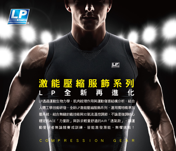 LP激能壓縮服飾系列,採用獨特精準分級加壓系統,結合無縫針織技術與3D氣流溫控設計,提供訴求核心穩定的[力量款]及強化輕量舒適的[透氣款],讓運動者無論競賽或是訓練都能激發潛能 · 無懼挑戰!